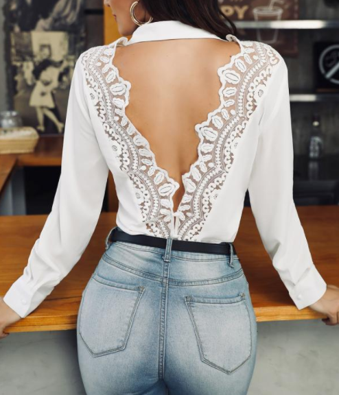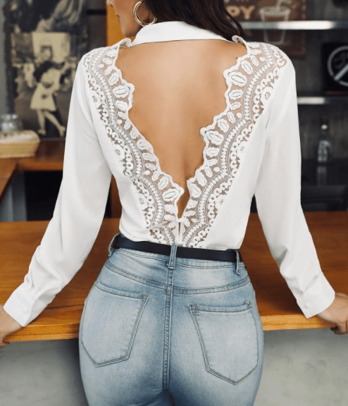 Esta camisa com detalhe de renda nas costas foi a primeira a me chamar atenção. Eu já adoro uma camisa branca social, acho que fica sempre linda e elegante, agora com detalhe de renda nas costas, achei de suspirar, pois também adoro roupas que deixam as costas à mostra e rendinhas sempre tornam nosso look mais fofo e leve.