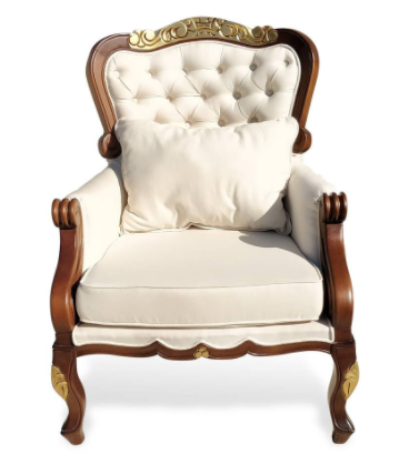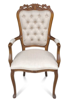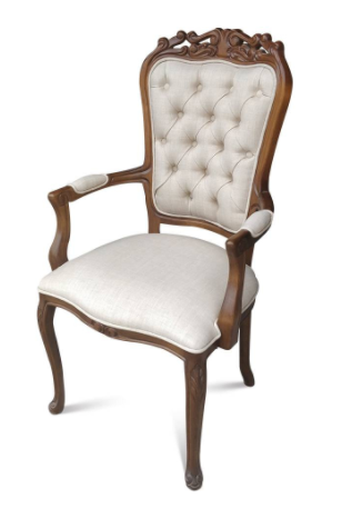 Outro lindo modelo que remonta à época é esta cadeira entalhada artesanalmente em madeira, com braço para maior conforto. Além de linda, percebe-se que é confortável. Também é personalizável, podendo-se escolher pintura e tecido que mais combinem com o ambiente. As famosas cadeiras de estilo Luis XV são conhecidas por oferecer luxo e comodidade. Uma combinação perfeita.